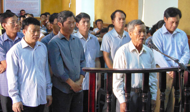 Nguyên phó chủ tịch huyện Nghi Xuân Lê Duy Việt cùng hàng loạt cấp dưới hầu tòa - Ảnh: Báo Tuổi Trẻ |