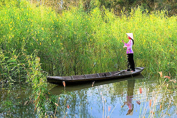 Hái xong rau, Út Duyên lại dẫn tôi đi đón ghe đáy chờ người ta mang cá vô bờ bán. Thú thực, ngồi bên nàng tiên xinh đẹp như em, tôi chỉ mong người ta lâu lâu hẵng vô bờ...