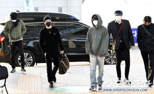 GOT7 mặc đồ đen và xám và bịt khẩu trang kín mít. |