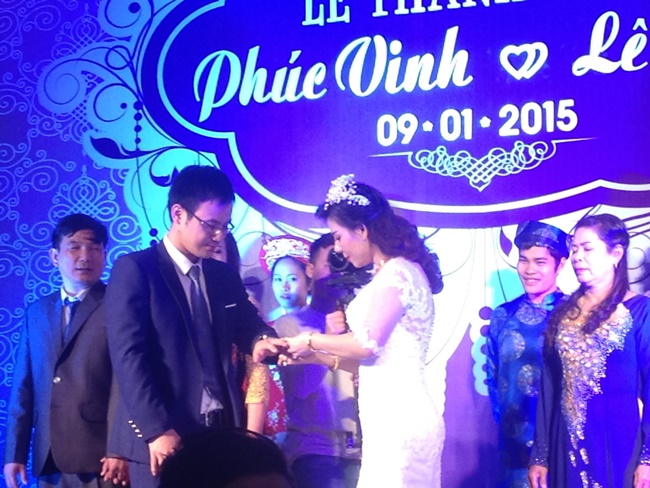 | Cô dâu Lê Mận và chú rể Phúc Vinh trao nhau chiếc nhẫn cưới. |