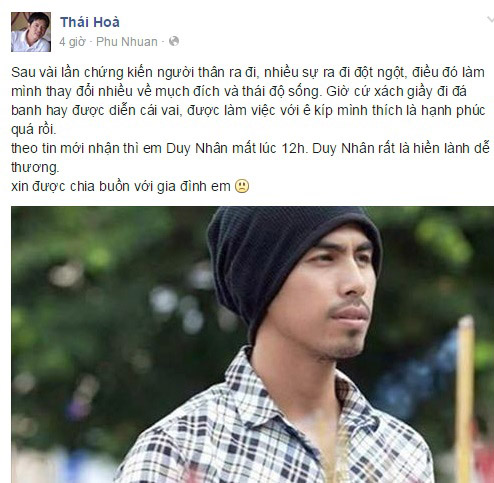 Diễn viên Thái Hòa viết: "Sau vài lần chứng kiến người thân ra đi, nhiều sự ra đi đột ngột, điều đó làm mình thay đổi nhiều về mụch đích và thái độ sống. Giờ cứ xách giầy đi đá banh hay được diễn cái vai, được làm việc với ê kíp mình thích là hạnh phúc quá rồi.
