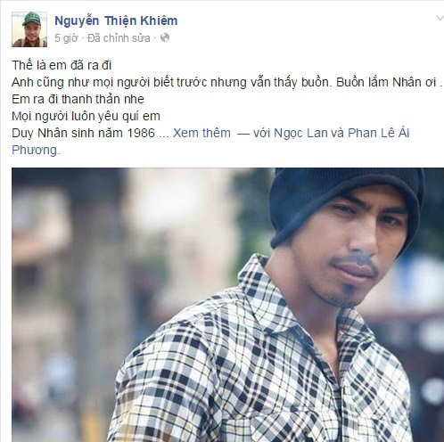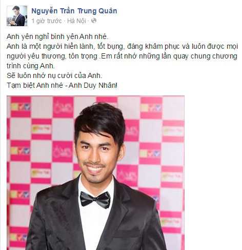 "Xin chia buồn cùng gia đình anh Duy Nhân một người anh từng ngồi tâm sự với tôi về cuộc sống và tương lai. Linh hồn anh đã lên thiêng đàng. Mong rằng anh ra đi và sẽ bắt đầu một cuộc sống mới nhiều niềm vui nơi thế giới bên kia. Tạm biệt người anh của Tôi. Mọi người sẽ mãi nhớ về anh" - người mẫu Ngọc Quyên.
