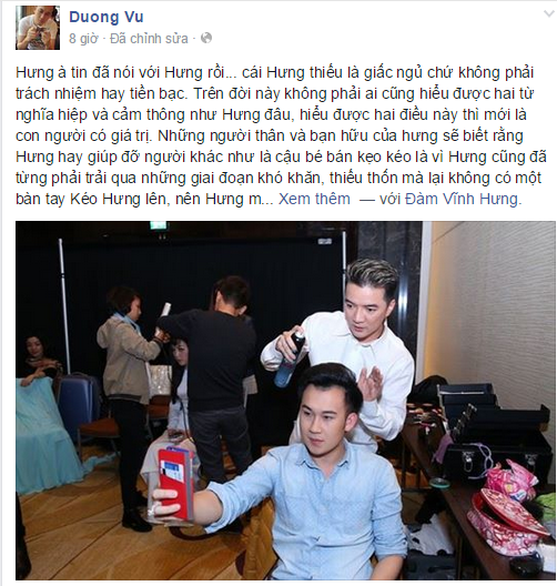 Dương Triệu Vũ - một người em thân thiết của Đàm Vĩnh Hưng cũng đã viết một status khá dài để bênh vực người đàn anh của mình. Anh vô cùng bối rối khi phải đứng giữa 2 người, một người là mối thâm tình còn một người là bạn thân.
