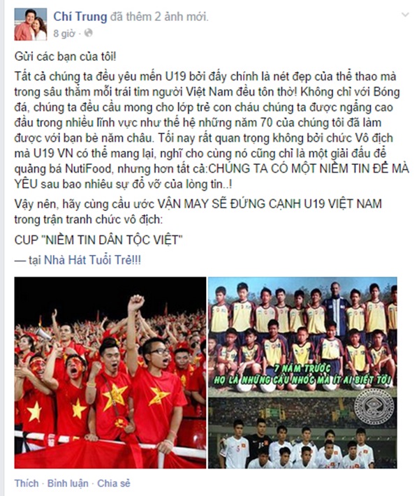 Tất cả chúng ta đều yêu mến U19 bởi đấy chính là nét đẹp của thể thao mà trong sâu thẳm mỗi trái tim người Việt Nam đều tôn thờ! Không chỉ với Bóng đá, chúng ta đều cầu mong cho lớp trẻ con cháu chúng ta được ngẩng cao đầu trong nhiều lĩnh vực như thế hệ những năm 70 của chúng tôi đã làm được với bạn bè năm châu. Tối nay rất quan trọng không bởi chức Vô địch mà U19 VN có thể mang lại, nghĩ cho cùng nó cũng chỉ là một giải đấu để quảng bá NutiFood, nhưng hơn tất cả:CHÚNG TA CÓ MỘT NIỀM TIN ĐỂ MÀ YÊU sau bao nhiêu sự đổ vỡ của lòng tin..!