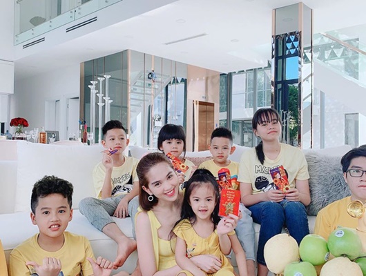 Ngọc Trinh rạng rỡ khi phát lì xì cho đàn cháu nhỏ. |