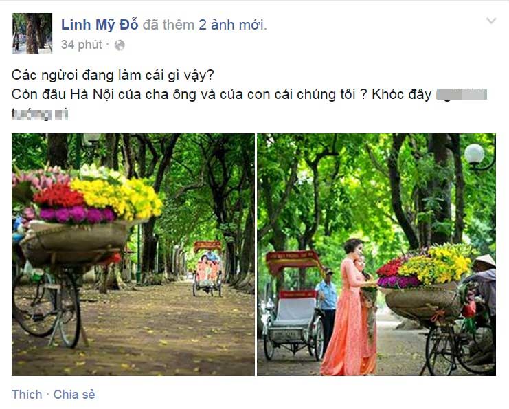Tuy không muốn bàn những thông tin mang tính chất thời sự trên Facebook cá nhân nhưng trước sự mất mát những hàng cây xanh ở Hà Nội, siêu mẫu Hà Anh đã phải đăng tải một đoạn chia sẻ khá dài lên tiếng phản đối việc gần 7000 cây xanh hiện đang bị đe doạ chặt phá hàng loạt. |