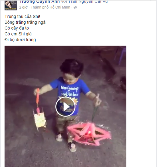 Ca sĩ Trương Quỳnh Anh đưa Sushi đi chơi và khoe đoạn clip ngắn bé Sushi rước đèn ông sao. |