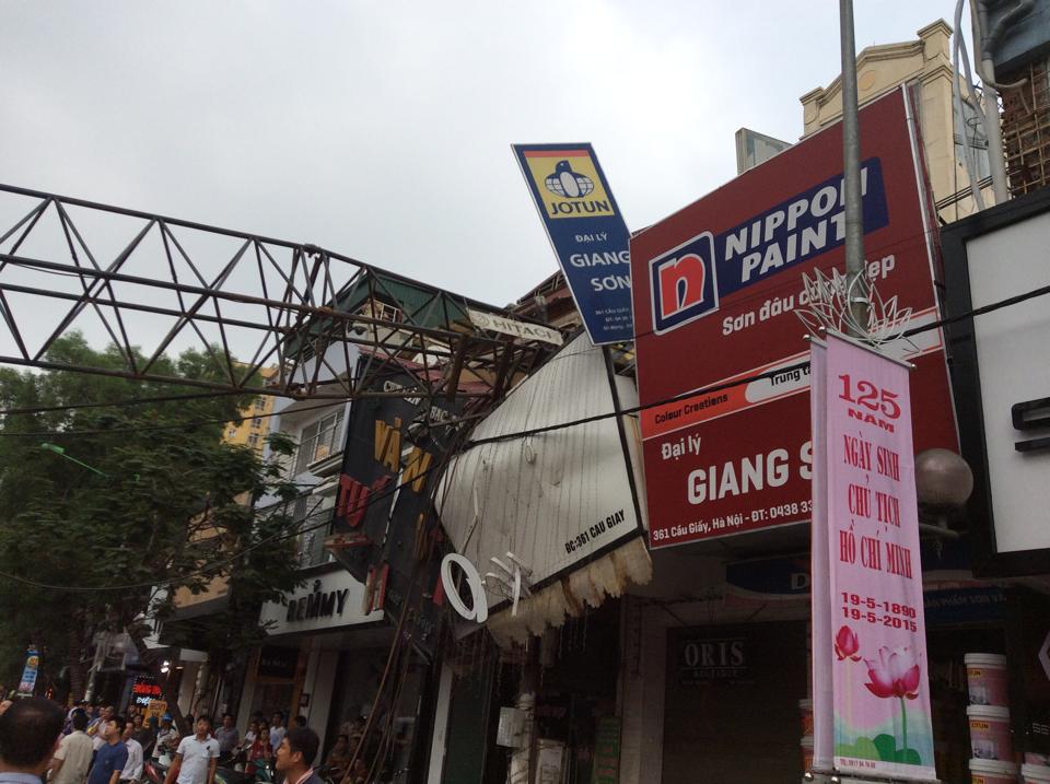Chiếc cần cẩu bị đổ đã đè vỡ bảng hiệu của cửa hàng vàng và cửa hàng sơn ở địa chỉ 359 Cầu Giấy. |