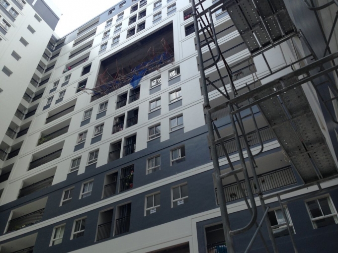 Giàn giáo vẫn đang đươc treo lơ lửng phí trên tòa nhà. |