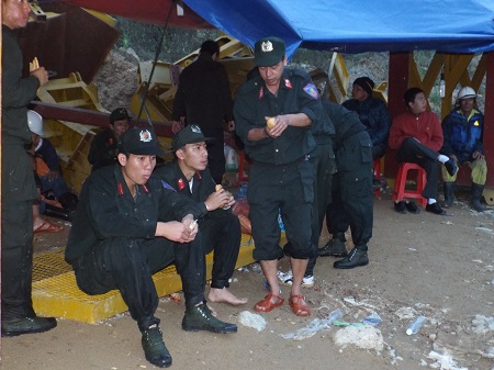 Tại hiện trường, sau khi dùng tạm bữa chiều bừng bánh mỳ, những công nhân của Công ty Cấp cứu mỏ thuộc Tập đoàn Than - khoáng sản VN đầu đội đèn pin trên đầu bước vào hầm để làm nhiệm vụ. Lực lượng này sẽ bắt đầu đào hầm, phương pháp đào dích dắc, có thể hình vuông hoặc hình chữ nhật tùy theo địa hình. Mục đích đào hầm để đưa 12 nạn nhân ra ngoài.