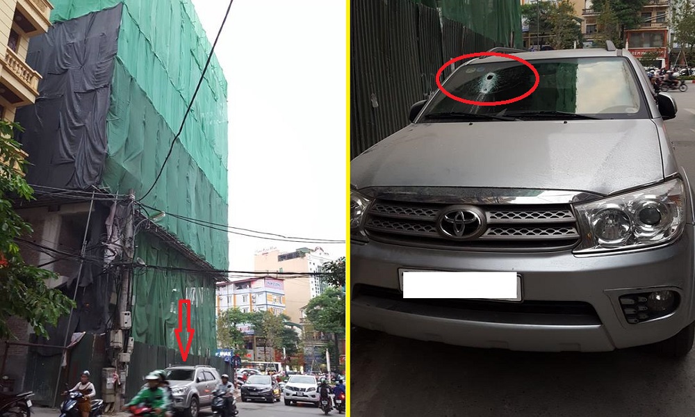 Một người dân ở gần khu vực xảy ra vụ việc cho biết, lúc đó, người này đang đóng cửa bỗng nghe thấy tiếng kính vỡ rất to. Khi quay người lại nhìn thì thấy một thanh sắt vuông dài khoảng 3 m cắm thẳng vào đầu chiếc xe ô tô đỗ dưới công trình xây dựng.