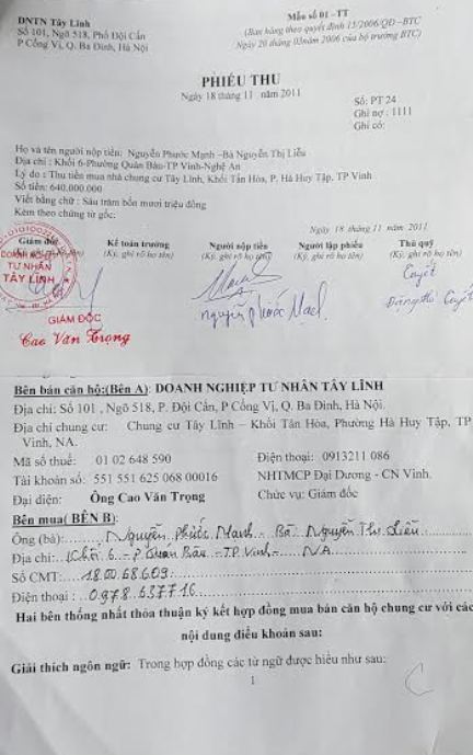 Hợp đồng và phiếu thu mua chung cư Tây Lĩnh của người dân. |