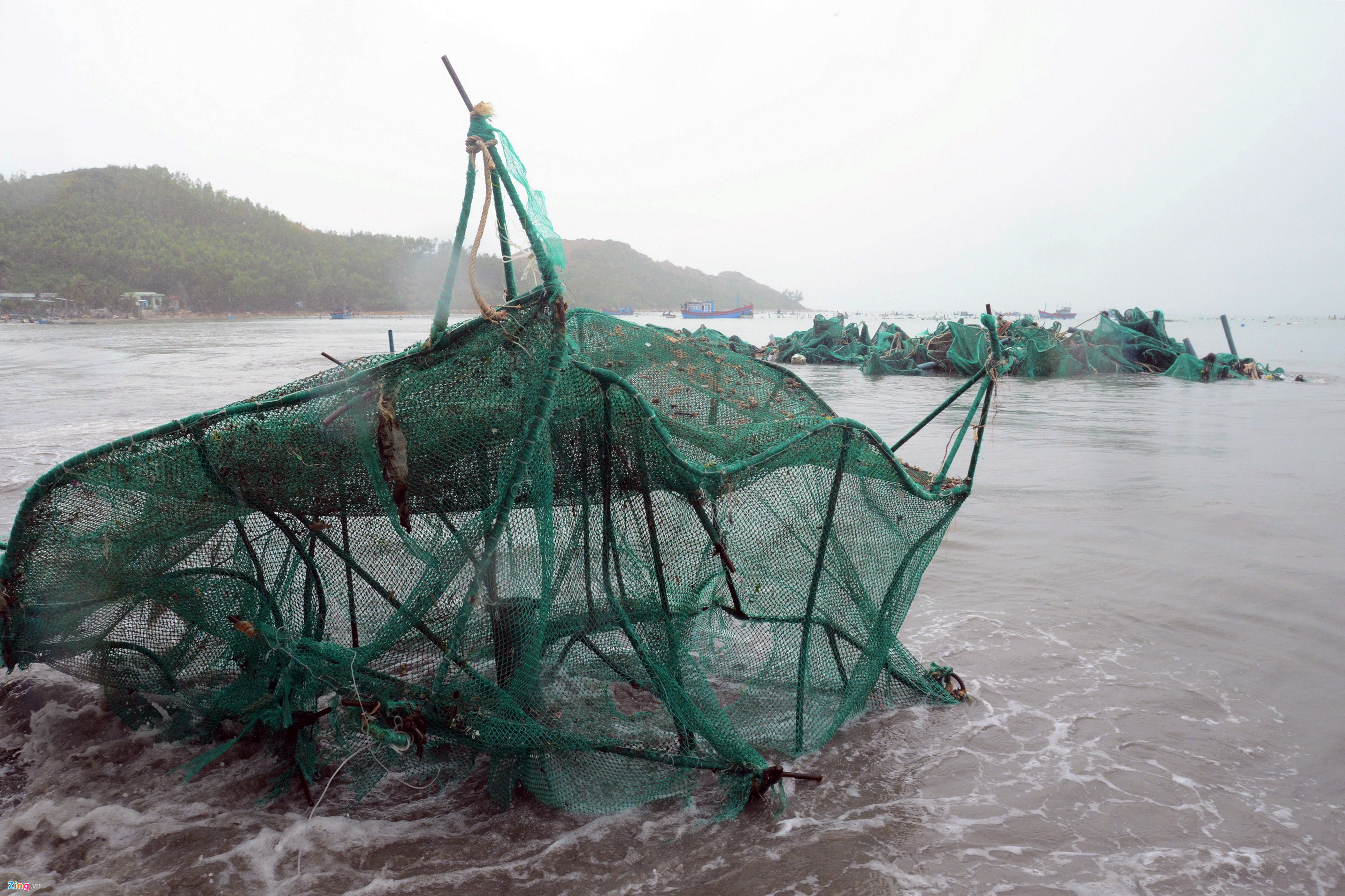 Sau khi bị sóng đánh hư hỏng nhiều lồng tôm chôi dạt vào bờ Ảnh: Tri thức trẻ |