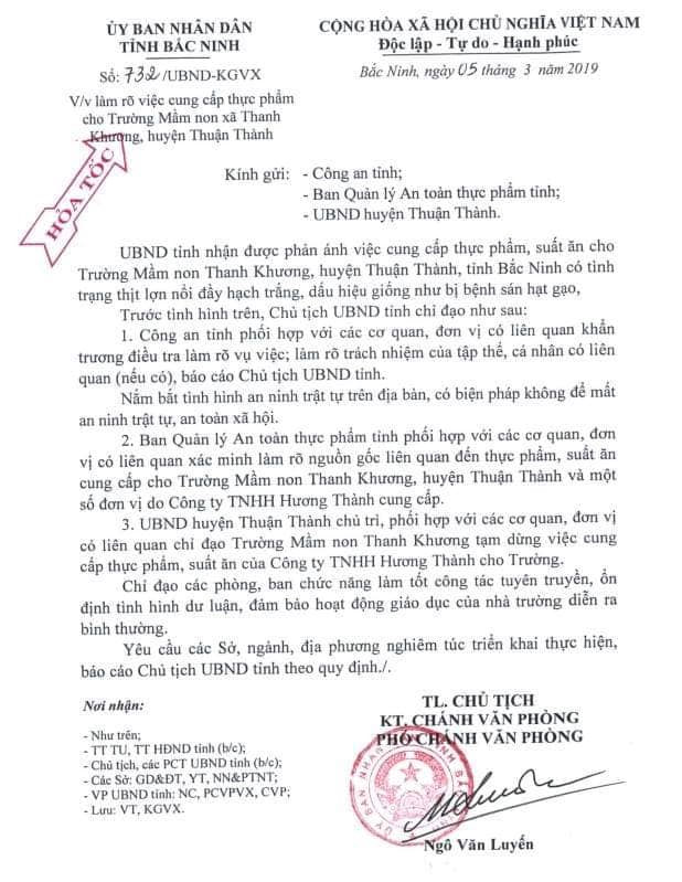 UBND huyện Thuận Thành chủ trì phối hợp ban ngành chức năng chỉ đạo trường Mầm non Thanh Khương tạm dừng nhận cung cấp thực phẩm của Công ty Hương Thành; làm tốt công tác tuyên truyền ổn định tình hình, duy trì hoạt động dạy và học bình thường của nhà trường cùng các em học sinh.