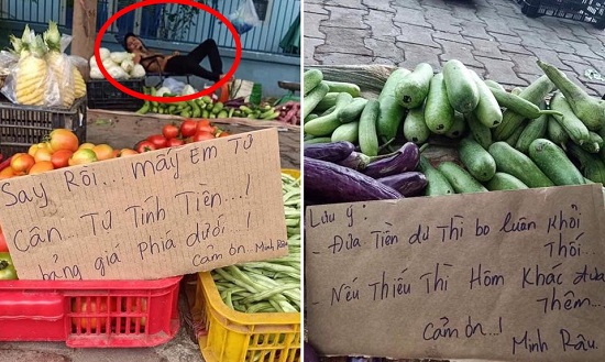 "Phê pha nhưng không bao giờ quên nhiệm vụ... Buôn bán bây giờ tin tưởng nhau là chính nên mọi người cứ tự giác nhé đừng phụ lòng tin của mình" - trích lời nói của chú Minh Râu sau khi nhậu 3 chai rượu, buồn ngủ mà vợ vẫn bắt ra trông sạp rau".