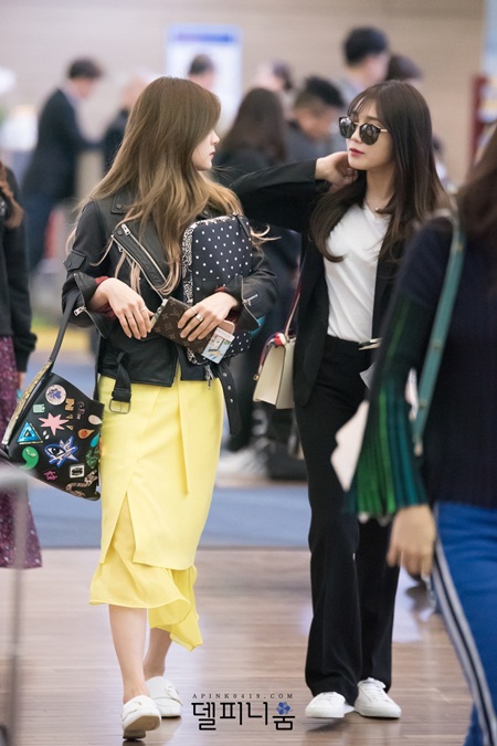 | Sân bay như trở thành sàn diễn thời trang của Chorong và Eunji. |
