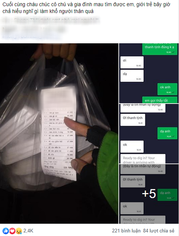 Xin chân thành cảm ơn cậu em khốn nạn đã boom hàng anh, thực ra anh đã linh tính được giọng điệu của 1 thằng trẻ trâu như em, nên anh đã làm đầy đủ các thủ tục bồi hoàn với Grab và Grab sớm thôi sẽ thanh toán lại số tiền kia cho anh. Chỉ tiếc tí tiền xăng, à không, tiền xăng ấy không vô nghĩa vì anh đã mang cả 13 suất cơm đó ra Cầu Rồng từ thiện hết cho 1 gia đình đang tìm xác con ở đây để họ có sức tìm người thân, họ cảm ơn anh nhiều lắm em ạ, và anh cảm thấy thật sự rất vui vì điều đó.
