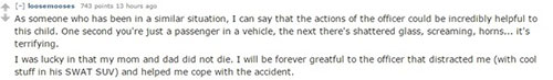 Là một người đã từng trong hoàn cảnh tương tự, có thể nói rằng hành động của vị sĩ quan là rất hữu ích cho đứa trẻ. Chỉ một giây trước bạn vừa mới là một hành khách trong chiếc xe, giây sau đã là những mảnh kính vỡ, tiếng la hét, tiếng còi xe ầm ý. Thật vô cùng đáng sợ."... |