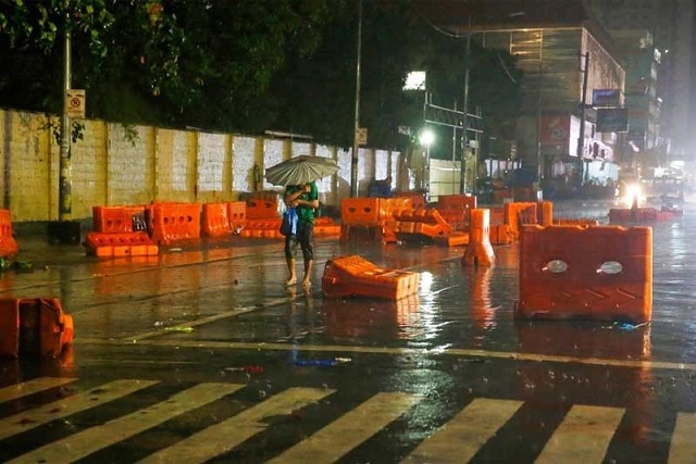 Đường phố Philippines rạng sáng 15/9 khi cơn bão đổ bộ. Một người đi bộ đang đi trên đường giữa những barrier bị bão cuốn ngổn ngang. Ảnh: AP. |