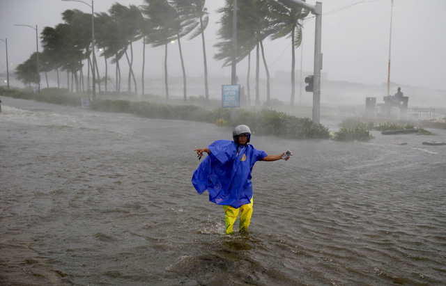 Các phương tiện giao thông tránh một con phố ngập nước trong bão Mangkhut. Ảnh: AP. |