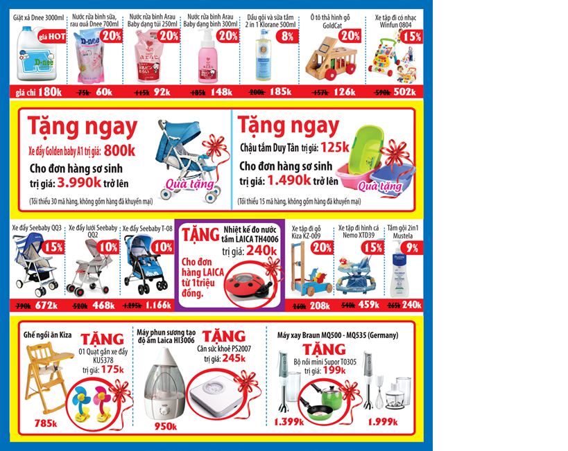 - Tặng xe đẩy trẻ em trị giá 800K cho đơn hàng sơ sinh trị giá 3990K trở lên.