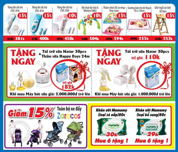 - Giảm 15\%toàn bộ xe đẩy Zaracos, toàn bộ hàng Dr.Brown.