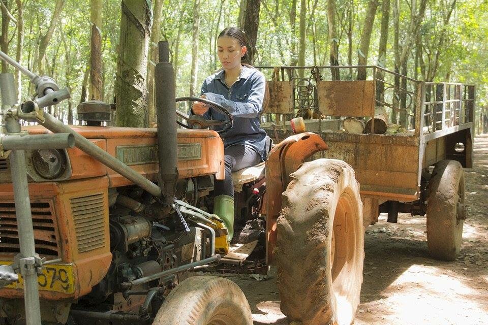 Diệu Huyền hóa thân thành cô gái nông thôn, hàng ngày phải lam lũ vất vả với máy cày, rừng cao su. |