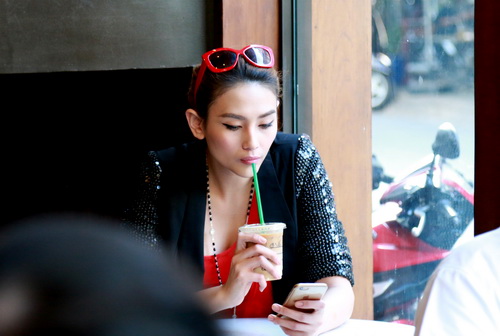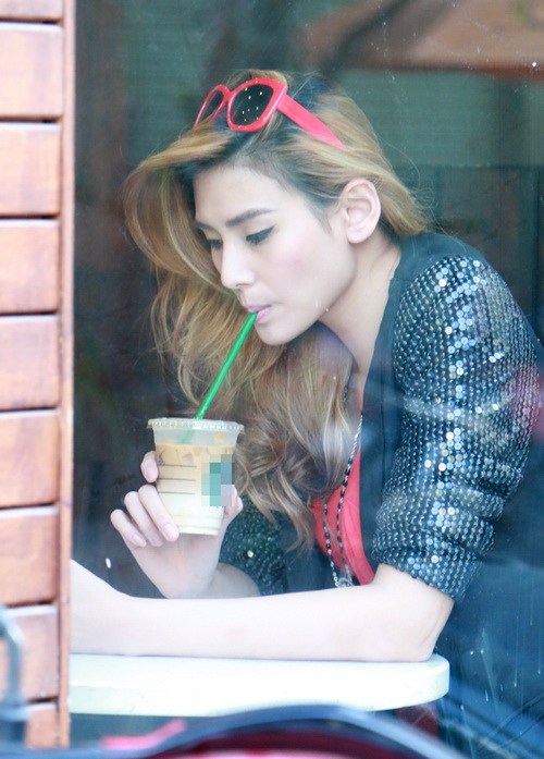 Xuất hiện chớp nhoáng trên phố nhưng người đẹp ăn mặc rất thời trang và nổi bật. Cô diện diện áo thun, đi đôi boots và dùng kính cùng tông đỏ kết hợp với quần và túi xách đen. Tuy nhiên, cô vẫn để lộ gương mặt phờ phạc khi ngồi trong quán cà phê.
