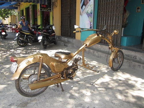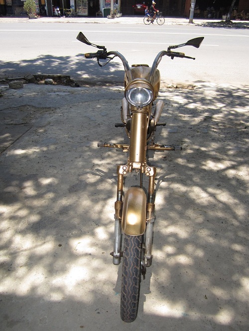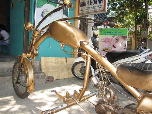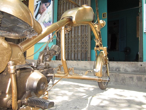Để có “siêu xe” trên, anh Phước đã mua một chiếc xe 78 cũ về cắt khúc sườn, mua một ống nước bằng sắt (độ dài tùy vào ý thích của mỗi người) rồi uốn cong làm thành “phần bụng” của xe.