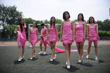 | Nhóm sinh viên này chỉ quấn trên người một dải ruy băng hồng hở hang, đầu đội chiếc mũ cử nhân và tạo dáng chụp ảnh nhí nhố, xa rời với ý nghĩa của chiến dịch. |