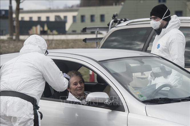 Nhân viên y tế kiểm tra thân nhiệt các tài xế ở Rozvadov, CH Séc ngày 14/3 - Ảnh: TTXVN |