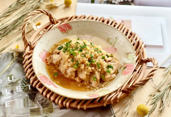 - Cuối cùng rắc tỏi lên trên rồi đem hấp. Hấp thịt gà khoảng 12 phút là thịt chín.