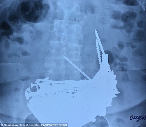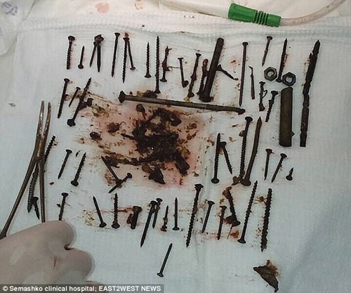 Các bác sĩ đã tiến hành phẫu thuật và lấy ra rất nhiều đinh dài, ốc vít, bu lông, chốt cửa... có cái dài đến hơn 15cm. Thậm chí còn có cả một chiếc vòng bạc.