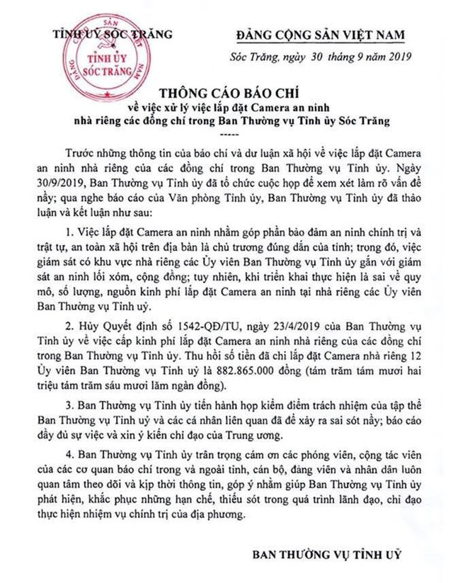 Thông tin từ báo Dân Trí cho hay, theo thông cáo báo chí của Tỉnh ủy Sóc Trăng ban hành chiều ngày 30/9, việc lắp đặt camera an ninh nhằm góp phần đảm bảo an ninh chính trị và trật tự, an toàn xã hội trên địa bàn là chủ trương đúng đắn của tỉnh; trong đó, việc giám sát nhà riêng của các Ủy viên Ban Thường vụ Tỉnh ủy gắn với giám sát an ninh lối xóm, cộng đồng.