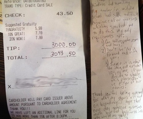 Người đàn ông tên Mike (ở TP New York) đã hào phóng rút tiền "boa" 3.000 USD sau khi dùng bữa hết 43,50 USD hồi tuần trước, tức là nhân viên phục vụ nhận được gấp gần 70 lần giá trị tổng hóa đơn.