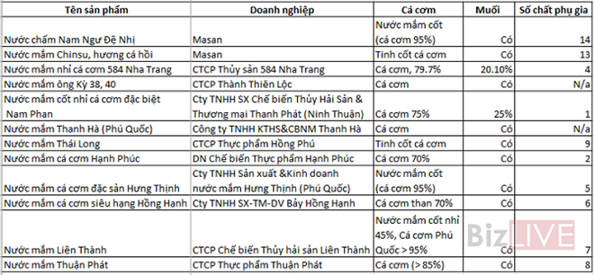 Nước mắm Hưng Thịnh có thành phần nước mắm cốt cá cơm, muối và 5 chất pha chế là chất điều vị và điều chỉnh axit. Nước mắm Liên Thành được ghi nhận đầy đủ tỷ lệ \% nước mắm cá cốt nhỉ được làm từ cá cơm tỷ lệ 95\% (45\%), muối, 6 chất phụ gia là nhóm chất điều vị và chất bảo quản.