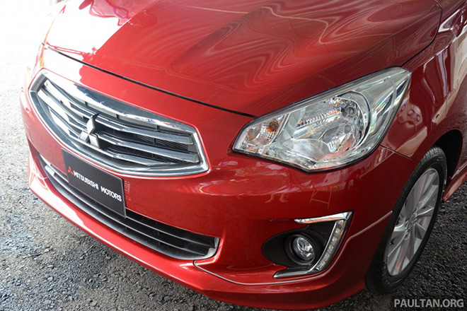 | Đầu xe khá giống như mẫu Mirage nhưng có phần cá tính hơn với cụm lưới tản nhiệt mạ chrome. |