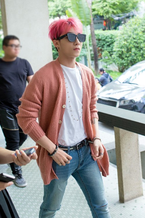 Dù mái tóc được nhuộm với màu sắc nữ tính cùng áo khoác len chung tông màu, nhưng nam ca sĩ sinh năm 1994 vẫn khiến nhiều fan nữ phát cuồng với hình ảnh lạnh lùng, điển trai không kém các tài tử Hàn.