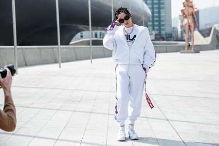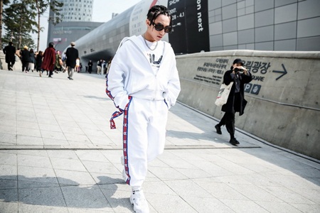 Bộ đồ thể thao màu trắng hiệu Vetements, áo trong Gosha Rubchinskiy và Fila kết hợp cùng giày Reebook Classic và kính Versace.