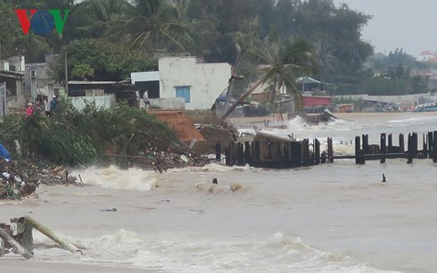 Ảnh hưởng của bão số 15 kết hợp với triều cường đã gây nên những con sóng lớn, biển xâm thực mạnh làm sạt lở gần 1 km bờ biển và sập 11 căn nhà ở Phan Thiết (Bình Thuận).