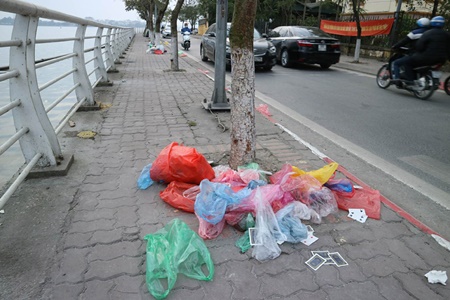| Túi nilon chất đống ở khu vực hồ Tây sau khi người dân thả cá. Ảnh: Vietnamnet |