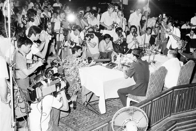 Sáng 1/5/1983, tại Phnom Penh, Bộ Ngoại giao Campuchia tổ chức họp báo, công bố việc rút một phần quân tình nguyện Việt Nam về nước sau khi hoàn thành nghĩa vụ quốc tế của mình. Ảnh: TTXVN |