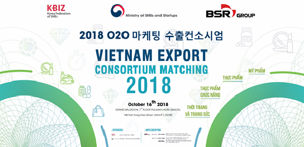 Nhằm mục đích đưa các sản phẩm, công nghệ phát triển tại Hàn Quốc tiếp cận rộng rãi tại thị trường Việt Nam, mang đến các cơ hội hợp tác hiệu quả cho các doanh nghiệp Việt Nam, vào ngày 16 tháng 10 năm 2018 tới đây tại khách sạn Pullman (Thành phố Hồ Chí Minh) sự kiện kết nối giao thương Việt Nam – Hàn Quốc “EXPORT COMSORTIUM 2018” sẽ được tổ chức dưới sự bảo trợ của Bộ Doanh Nghiệp Vừa và Nhỏ Hàn Quốc (SMEs), Hiệp hội doanh nghiệp vừa và nhỏ Hàn Quốc (K-BIZ), cùng đơn vị thực hiện và hỗ trợ sự kiện là tập đoàn BSR Group nhằm giới thiệu về sản phẩm và công nghệ của 16 doanh nghiệp thuộc các lĩnh vực mỹ phẩm, thực phẩm, thời trang, sản phẩm chăm sóc sức khỏe,....