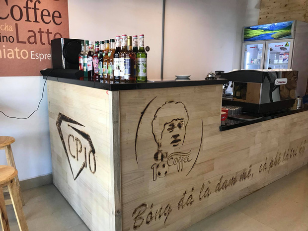 Quán cà phê của trung vệ khoác áo CLB Viettel được trang trí theo phong cách bóng đá với hình ảnh các danh thủ bóng đá nổi tiếng trên thế giới như Maradona, Messi, Ronaldo...