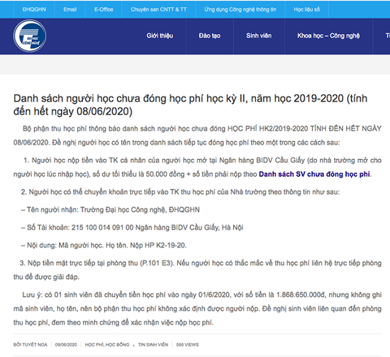 Mới đây, chiều 9/6, trong một thông báo về danh sách sinh viên chưa đóng học phí kỳ II năm học 2019 - 2020, đại học Công nghệ - đại học quốc gia Hà Nội, gây chú ý với thông tin về "một sinh viên chuyển tiền học phí vào ngày 1/6/2020, với số tiền là 1.868.650.000 đồng, nhưng không ghi mã sinh viên, họ tên, nên bộ phận thu học phí không xác định được người nộp".