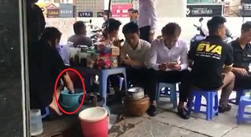 Cụ thể, trong đoạn clip một cô gái mặc áo đen được cho là con gái chủ quán trà đá, rất vô tư rửa chân trong một xô nước xanh đặt bên cạnh. Sau đó, cô gái tiện thể lấy luôn nước từ chính trong chiếc xô ấy pha trà đá bán cho khách và hẳn nhiên là những vị khách chẳng biết chuyện gì vừa xảy ra, vẫn vui vẻ đón cốc nước từ tay người bán.