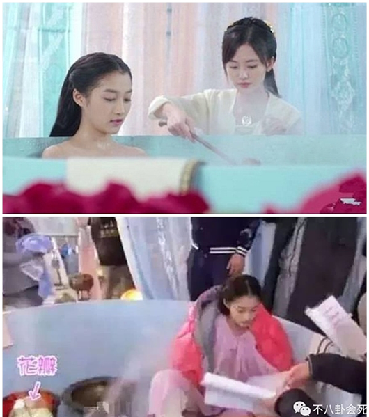 Tuy nhiên thực sự trong bồn tằm không hề có nước mà chỉ có những chiếc máy phun hơi nước mini được tổ đạo cụ chuẩn bị. Nữ diễn viên cũng diện áo bình thường, chỉ kéo xuống để lộ phần vai. |