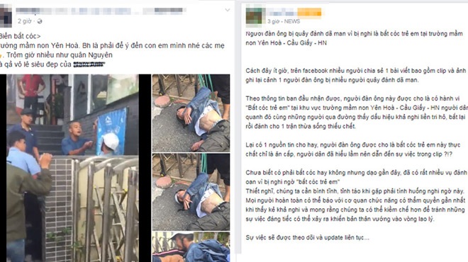 Báo Dân Việt đưa tin, chiều 1/8, trên mạng xã hội lan truyền clip kèm một số hình ảnh người dân trung tuổi có nhiều hình xăm bị hàng chục người hành hung, trói tay chân ở phường Yên Hòa, quận Cầu Giấy (Hà Nội). Theo nội dung được chia sẻ, người đàn ông bị người dân đánh đập được cho là bắt cóc trẻ em tại khu vực trường mầm non Yên Hòa. Khi phát hiện sự việc, người dân đã cầm gậy, xẻng và gạch bao vây, uy hiếp người đàn ông này.