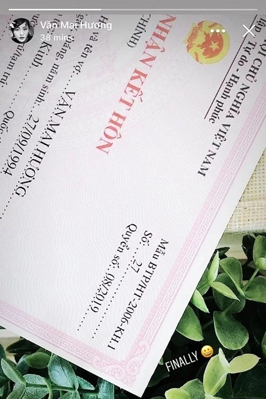 Văn Mai Hương chia sẻ giấy đăng ký kết hôn, úp mở về đám cưới. |