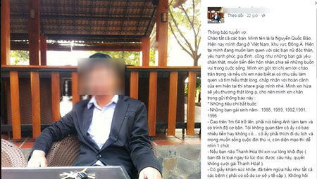 Trước đó, vào chiều qua, dư luận mạng đã nổi sóng với “thông báo tuyển vợ” của nick facebook Nguyễn Quốc Bảo. Điều khiến cái “thông báo” này trở nên nổi tiếng trên mạng là vì trong đó đặt ra các tiêu chí rất cao như: biết tiếng Anh, nấu ăn được 100 món, không hôi nách, còn ‘zin’ và đặc biệt không phải là dân Thanh Hóa.